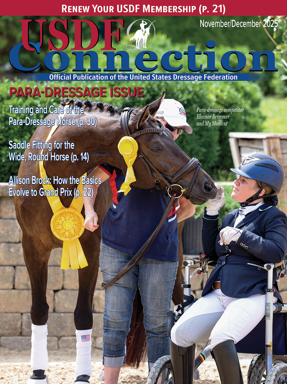 USDF Connection focuses on USDF’s educational mission and the interests and needs of the American dressage community. The magazine offers a thoughtful and informative mix of USDF and dressage-community news, educational articles, features on the issues and personalities who are shaping the sport of dressage in America, and essays and commentary by many of the most recognized and respected names in the sport.