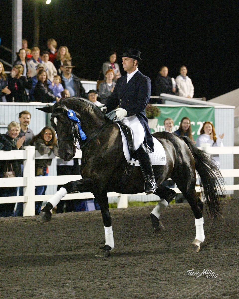 Rocher is a dressage icon in the United States, for those that witnessed her in competition before her retirement in 2009. Owned by Charles and Joann Smith, of Richwood, OH, this German born 25-year-old Westfalian mare (by Rolls Royce and out of Fraenzi) touts a long and successful competition record, including 59 Grand Prix tests on file with USDF. In 2002, Rocher, and rider George Williams, played to the crowds winning the Grand Prix Freestyle at Dressage at Devon as well as the Grand Prix for the Region 2 Championships. In 2003, Rocher added international competition to her repertoire, finishing fifth in the FEI World Cup Freestyle. That same year, Rocher was named the USDF Grand Prix and Grand Prix Freestyle Horse of the Year, as well as The Chronicle of the Horse Dressage Horse of the Year.